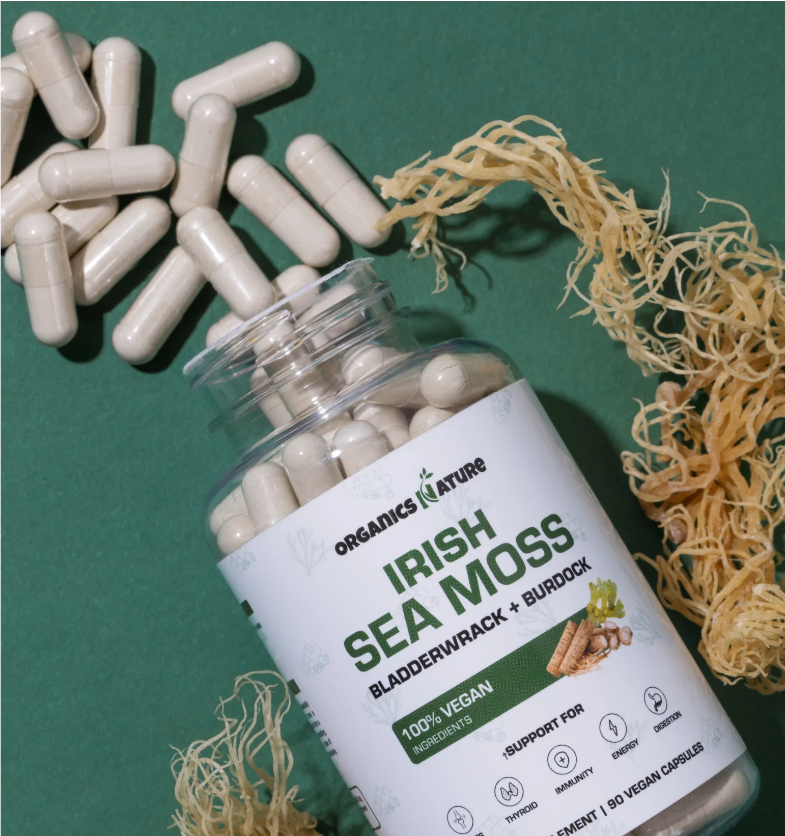 1000MG of Organic Irish Sea Moss, containing over 90 vitamins and minerals that improve gut health, heart & nerve function, support immune system, regulate blood pressure, support thyroid, and clears mucus.