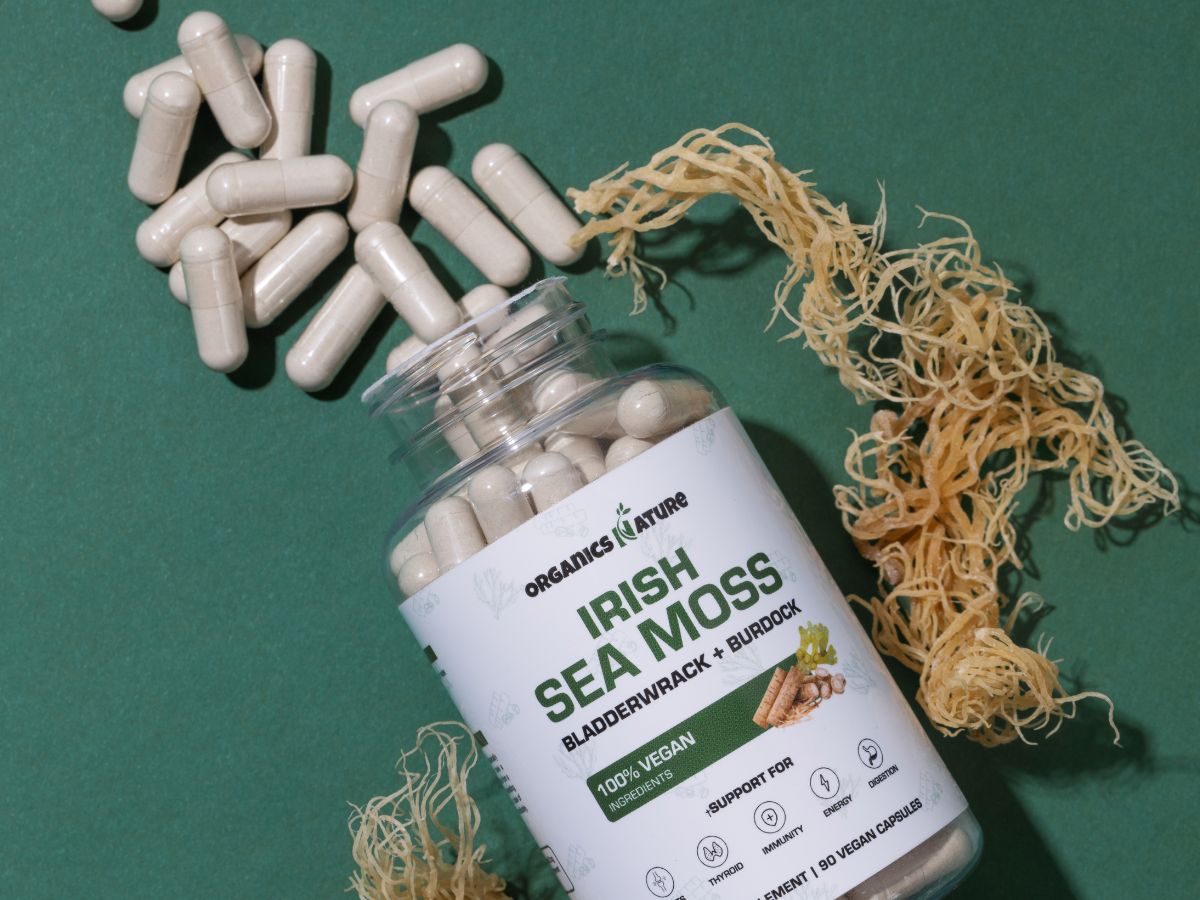 1000MG of Organic Irish Sea Moss, containing over 90 vitamins and minerals that improve gut health, heart & nerve function, support immune system, regulate blood pressure, support thyroid, and clears mucus.
